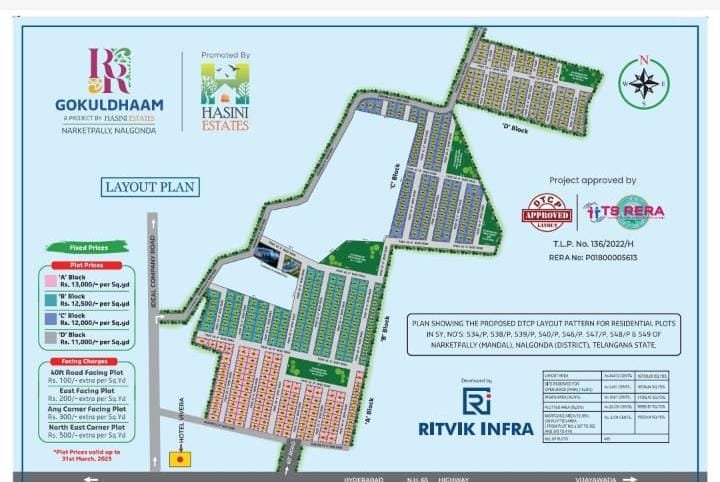 Our newest offering, Gokuldhaam at Narketpally , continues this legacy — featuring a DTCP‑approved, TS RERA‑registered gated township spread over 36 acres. With its prime location adjacent to NH-65 and opposite to the renowned Venu Gopala Swamy Temple, it’s perfectly placed for both spiritual ambience and rapid development.